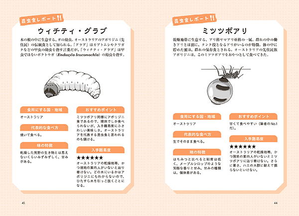 生産・採集地に赴き、自ら食べに行かないと、その味を堪能できないものがほとんどである食用昆虫。会社員である著者がタイ、カンボジア、オーストラリア、アメリカ、メキシコ、ペルー、マレーシア、ラオス、ザンビア、中国など、世界を駆けめぐり、食用昆虫を探し、捕り、食べ、さらには養殖にチャレンジ! 旅行記・グルメ本として楽しめるのはもちろん、昆虫の生態や、文化・産業・貿易など様々な観点からの解説も掲載し、昆虫食の入門書としても活用できる一冊。